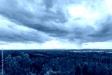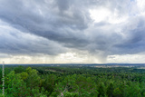 Dramatic Storm Clouds and Rain Showers Over Forest Landscape Seen from Hjells Hill Tower in Norway