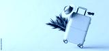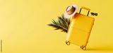 Travel luggage with summer accessories on yellow background with copy space. Summer travel banner design. 3D Rendering, 3D Illustration