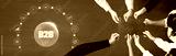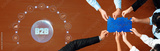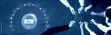 Diverse business team collaborates on puzzle pieces symbolizing teamwork and strategy while integrating digital elements representing B2B solutions and networking. Trope