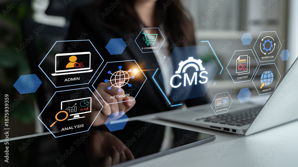 Concept of a Content Management System (CMS). A platform for website administration, digital content creation, workflow management, and e-commerce integration. Fermion