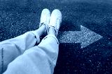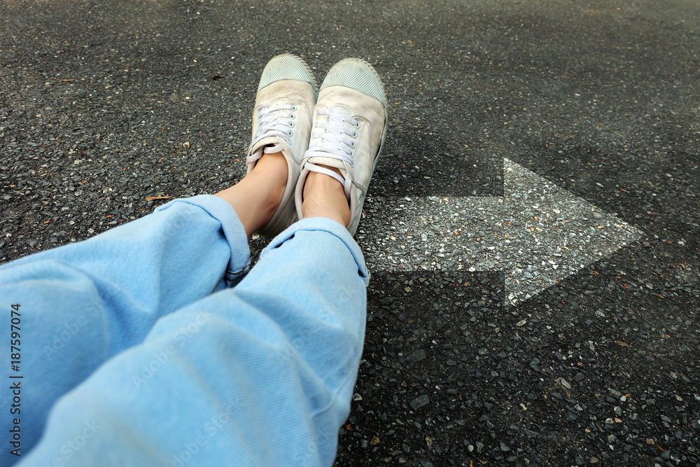 Selfie White Shoes Concept. Female Wearing White Sneakers with White Arrows Line Direction on Concrete Road Background Great for Any Use.