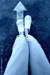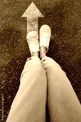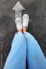 Selfie White Shoes Concept. Female Wearing White Sneakers with White Arrows Line Direction on Concrete Road Background Great for Any Use.