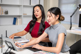 Pretty asian woman and coworker looking at tablet aside working materials on table in the office.