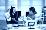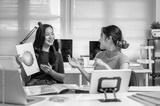 Pretty asian woman showing color palette to coworker aside working material on table in the office.