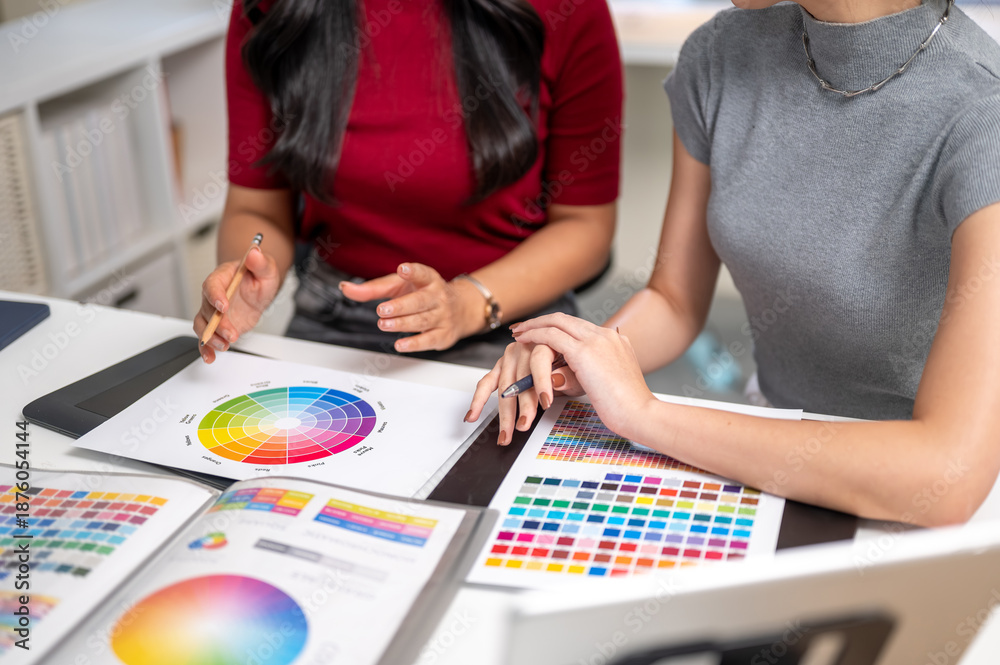 Close up of woman holding pencil talking to coworker over color chart as sitting at table in office.