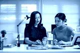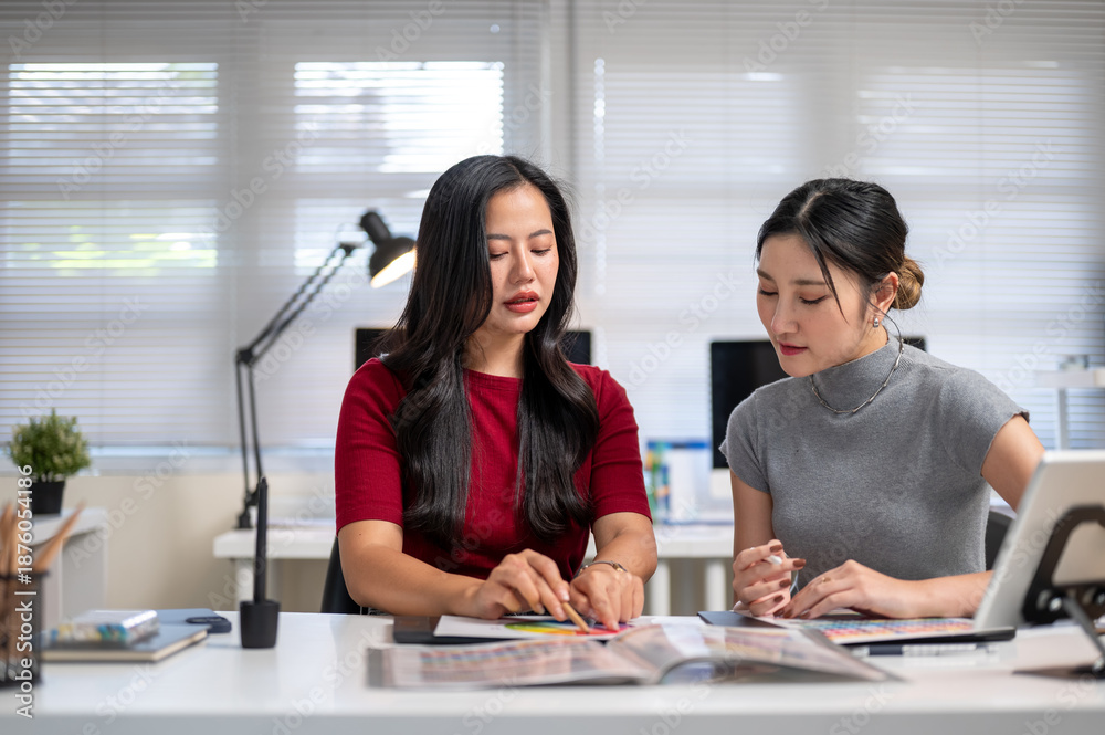 Asian woman talking to friend or coworker over document aside tablet on table in home office studio