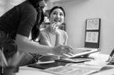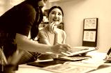 Pretty asian woman holding clipboard looking at a talking friend or coworker sitting on office table