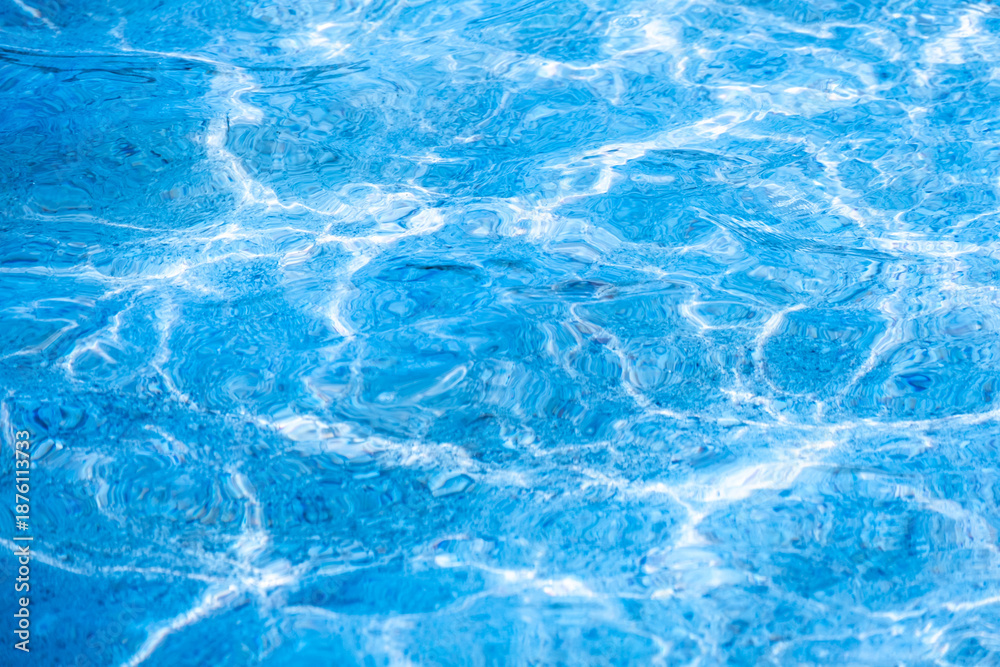 Close-up of bright blue swimming pool water surface with sunlight reflections and ripples, refreshing summer vacation and tropical luxury background.concept relex