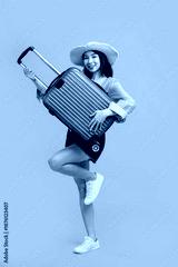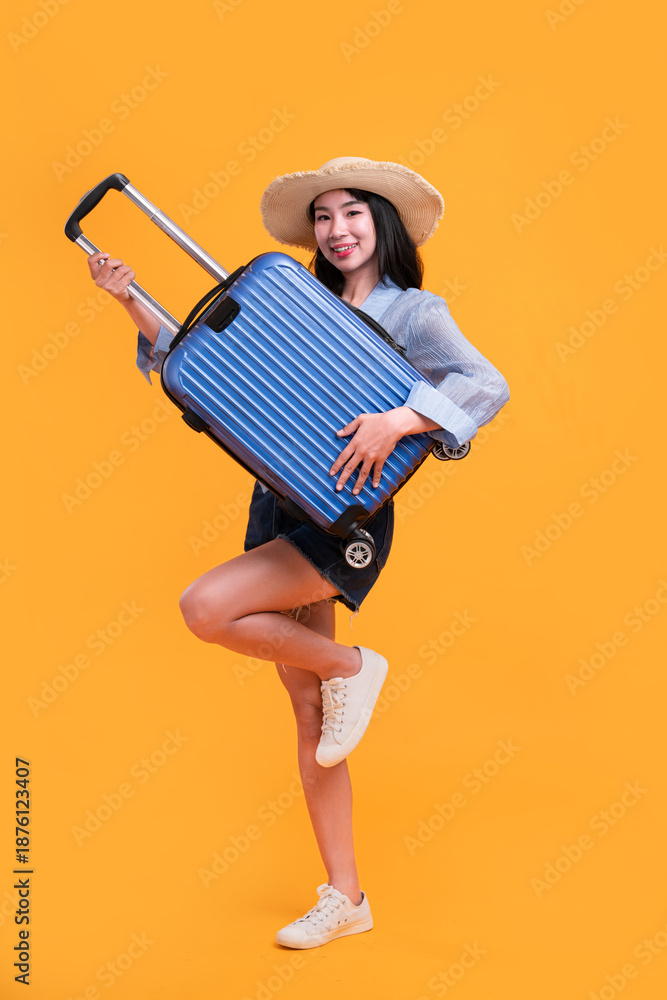 Happy Asian woman traveler standing and holding suitcase isolated on yellow background, Tourist girl having cheerful holiday trip concept, Full body composition.