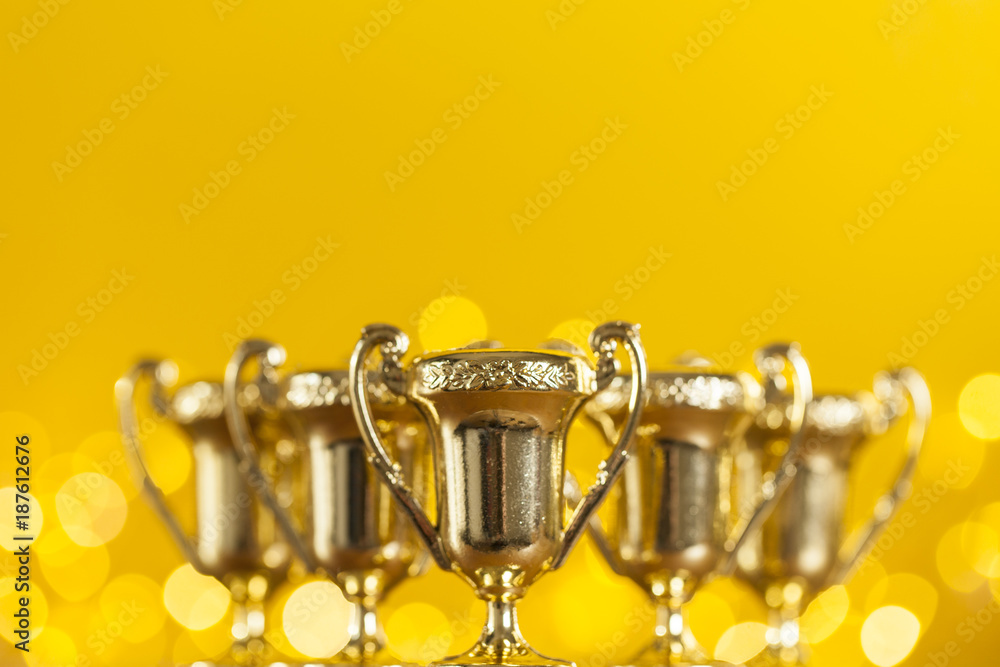 Gold award trophy against bright yellow background with blurred lights