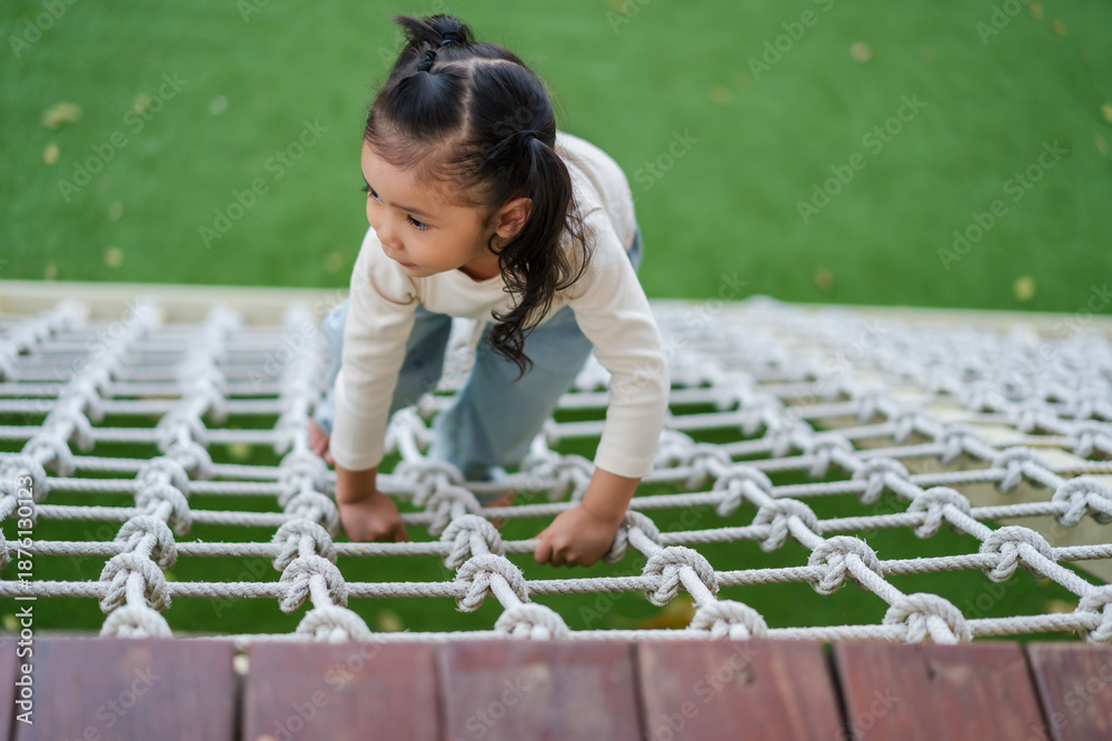 happy child girl playing with climbing ropes net at outdoor playground