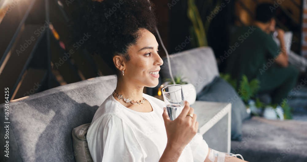 Happy woman, water and wellness in clinic with iv drip, detox and antioxidants for hydration benefits. Person, smile and liquid in medical spa with intravenous fluid, vitamins or minerals for health.