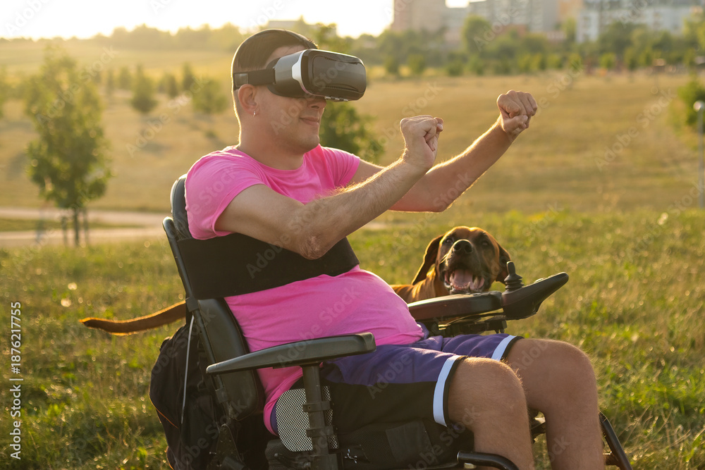 Man in a wheelchair testing VR glasses with new program, enjoying immersive digital experience in a meadow.