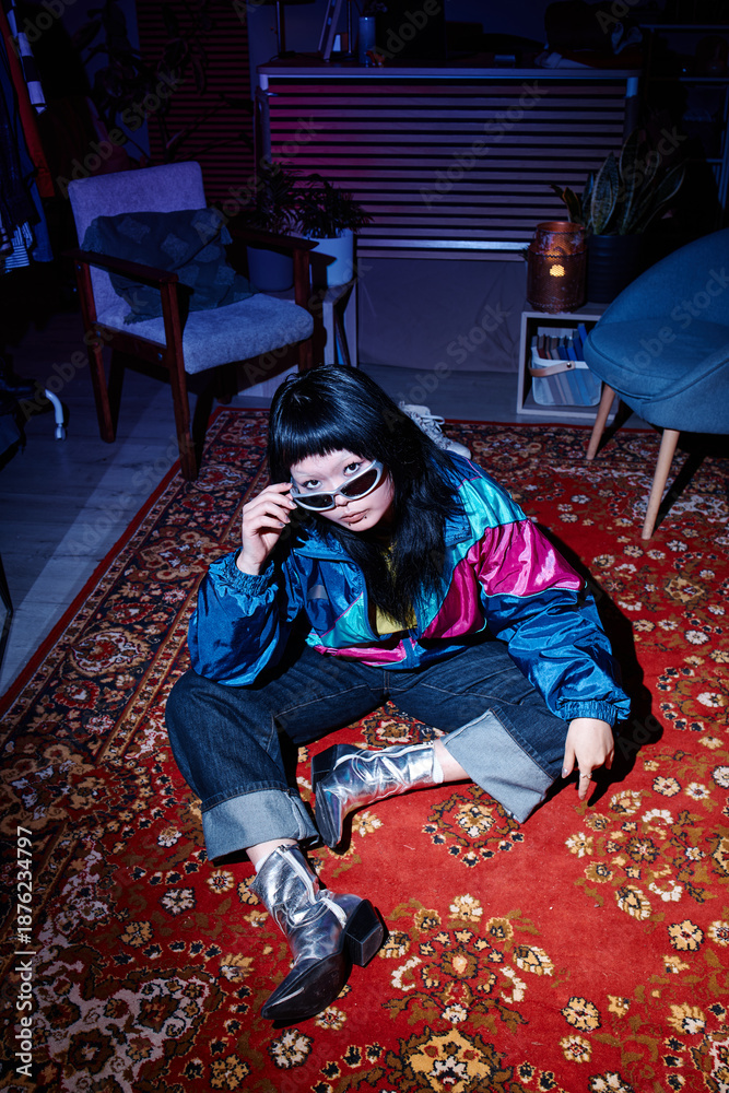 Young adult Asian woman sitting on patterned carpet in vintage room, wearing retro sunglasses and metallic boots, glancing upward with confident expression, second hand fashion concept