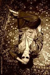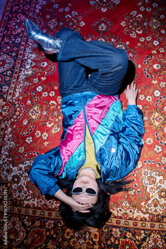 Young adult Asian woman lying on patterned carpet wearing sunglasses and vintage windbreaker, holding hand to forehead, embodying retro fashion style associated with second hand shopping