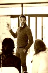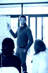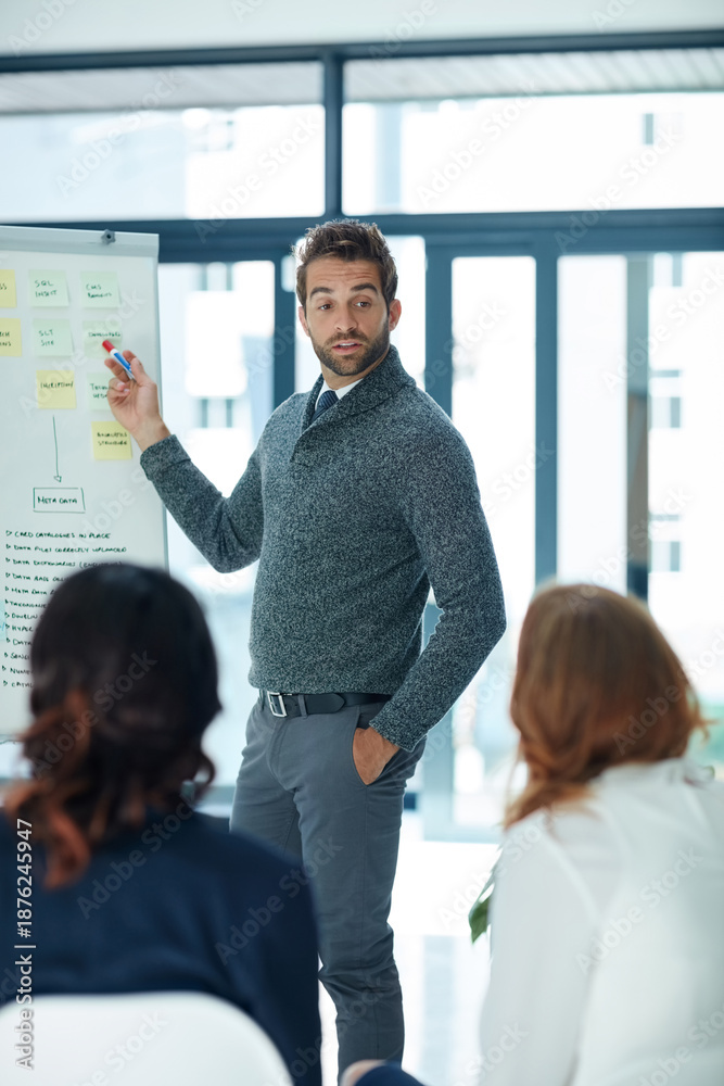Man, presentation and whiteboard for meeting, training or workflow steps for web design office. Speaker, people and project management with process, teaching workshop or sticky note for feedback