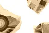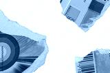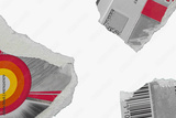 Torn paper pieces with ragged edges, scrap, labels, design elements on transparent background. Torn pieces of colorful printed packaging on white background
