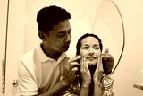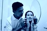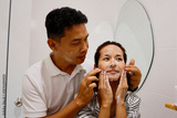 Woman and man washes her face in the morning with facial foam.
