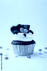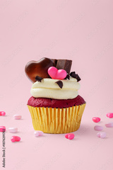 Red velvet cupcake with cream cheese frosting, decorated with heart chocolate on pink background, valentines day and celebrating love concept