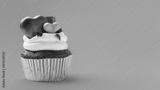 Red velvet cupcake with cream cheese frosting and heart chocolate valentines day decorated on blue background