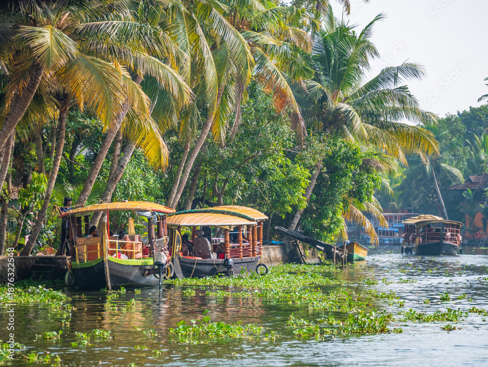 Traditional houseboats cruising the Kerala backwaters in India, surrounded by lush palm trees and calm tropical waterways, evoking slow travel, relaxation, nature, and everyday local life.