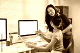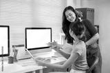 Pretty asian woman talking to friend coworker holding color palette sits at computer table in office