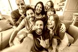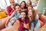 Group of friends taking selfie with smart mobile phone device at home - Happy young people smiling together at camera - University students having fun together in college campus - Friendship concept
