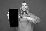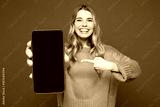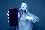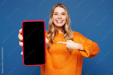 Young happy woman wears yellow sweater casual clothes hold in hand use point finger on mobile cell phone with blank screen workspace area isolated on plain blue background studio. Lifestyle concept.