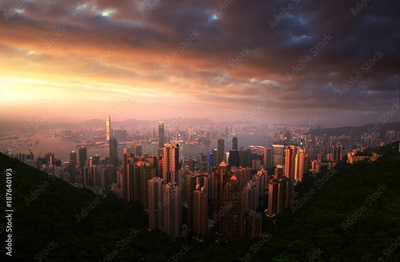 Sunset over Victoria Harbor from Victoria Peak in Hong Kong