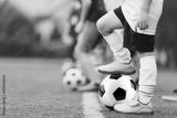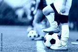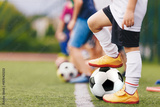 Football soccer training game for children. Kids playing with soccer balls on grass pitch