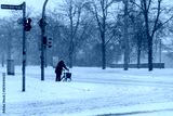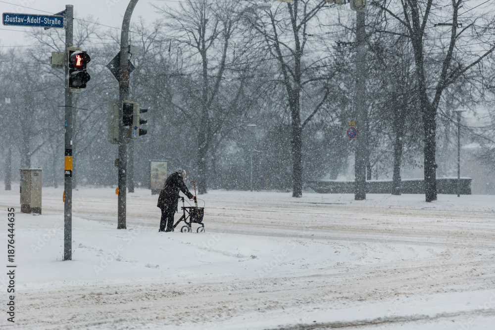 Senior woman crosses snowy city intersection with walker during winter snowfall and icy road conditions. Traffic lights and low visibility emphasize vulnerability, limited mobility and need for care