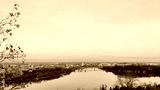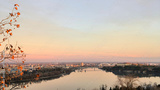 colorful sky at sunrise with dramatic clouds over the Danube river with view at Petrovaradin Fortress