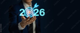 Planning,vision,Set goals for 2026,businessman holds text 2026 with arrow target,implementation of business goals plan,strategy, development to achieve goals and success.