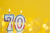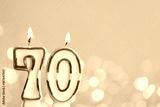 Number 70 birthday celebration candle against a bright lights and yellow background