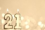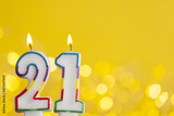 Number 21 birthday celebration candle against a bright lights and yellow background