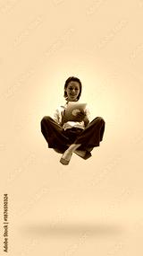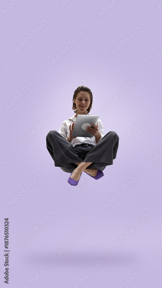 Young professional levitating while using tablet in office style. Concept of mobile workflow, task flexibility, mobile productivity, flexible schedule and stress free business lifestyle.