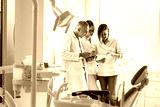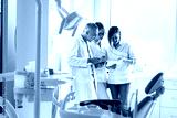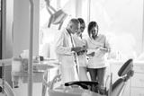 Medical dentist team in dental office discuss about practice and examining list of patients.