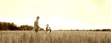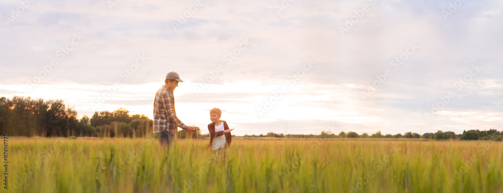 Farmer and his son in front of a sunset agricultural landscape. Man and a boy in a countryside field. Fatherhood, country life, farming and country lifestyle concept.