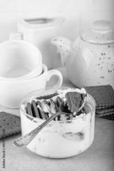 Simple two ingredient yogurt cheesecake in glass, viral tasty quick recipe made with greek yogurt and chocolate biscuits, copy space