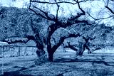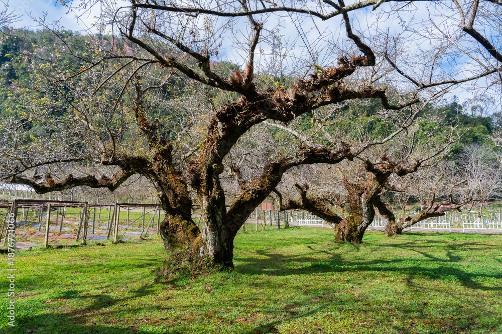 Old plum tree with blossom buds in orchard under blue sky with green grass and forest background creating peaceful nature scene