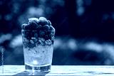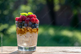 Summer breakfast layered dessert in a glass of oatmeal, blueberries, raspberry, walnut, olive oil and honey on nature background, closeup. Healthy diet with fresh berries on wooden table