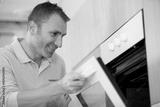 male wearing blue shirt in modern kitchen open oven door
