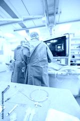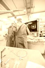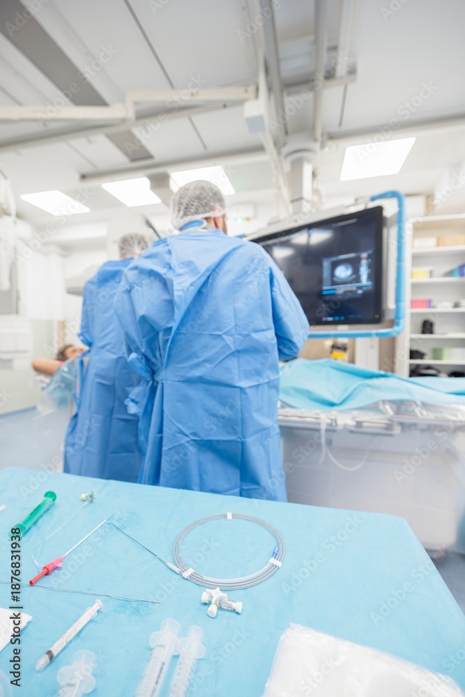 Two dedicated surgeons work meticulously in a brightly lit operating room, focused on a monitor as they conduct an intricate medical procedure. Supplies are neatly arranged nearby