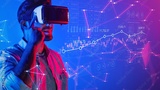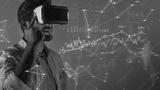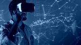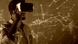 A person interacts with a virtual reality headset, engaging in stock market analysis. The scene features vibrant graphics representing data trends and advanced technology. Raster