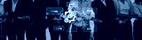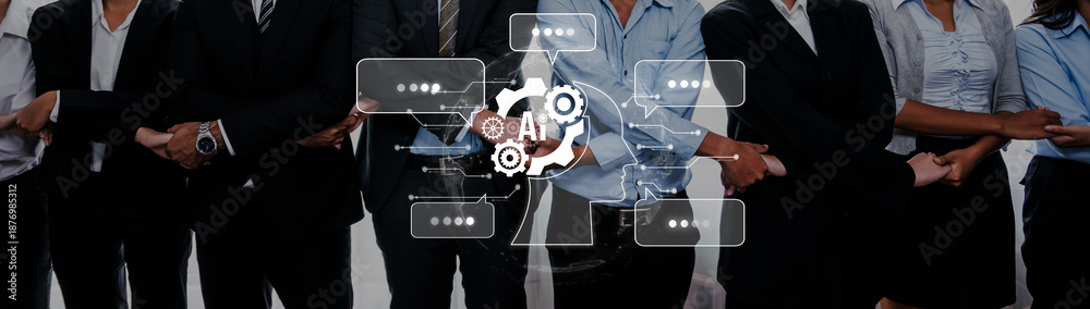 A diverse group of business professionals standing together, showcasing collaboration and technological advancement through digital interface symbols in a corporate environment. Trope