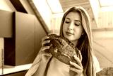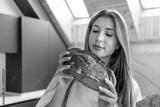 Woman examines fresh homemade bread in kitchen. Bread aroma.