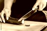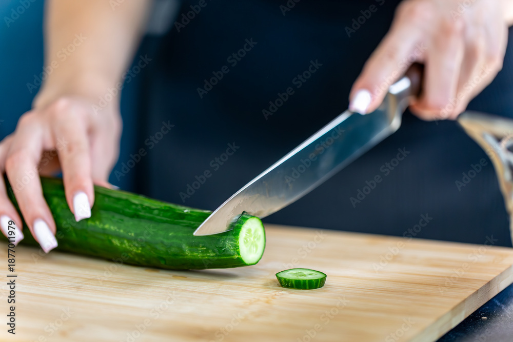Slicing cucumber on a wooden board. Fresh salad.