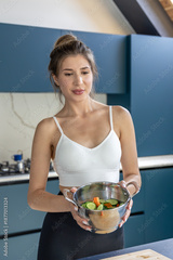 Woman holds colander with veggies in bright kitchen fresh mood. Green salad.