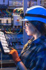 Woman electrician focuses on tablet schematics. Smart diagnostics.