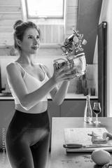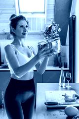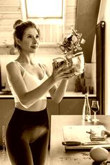 Woman tosses cucumber and pepper mix in bright kitchen. Salad in the air.